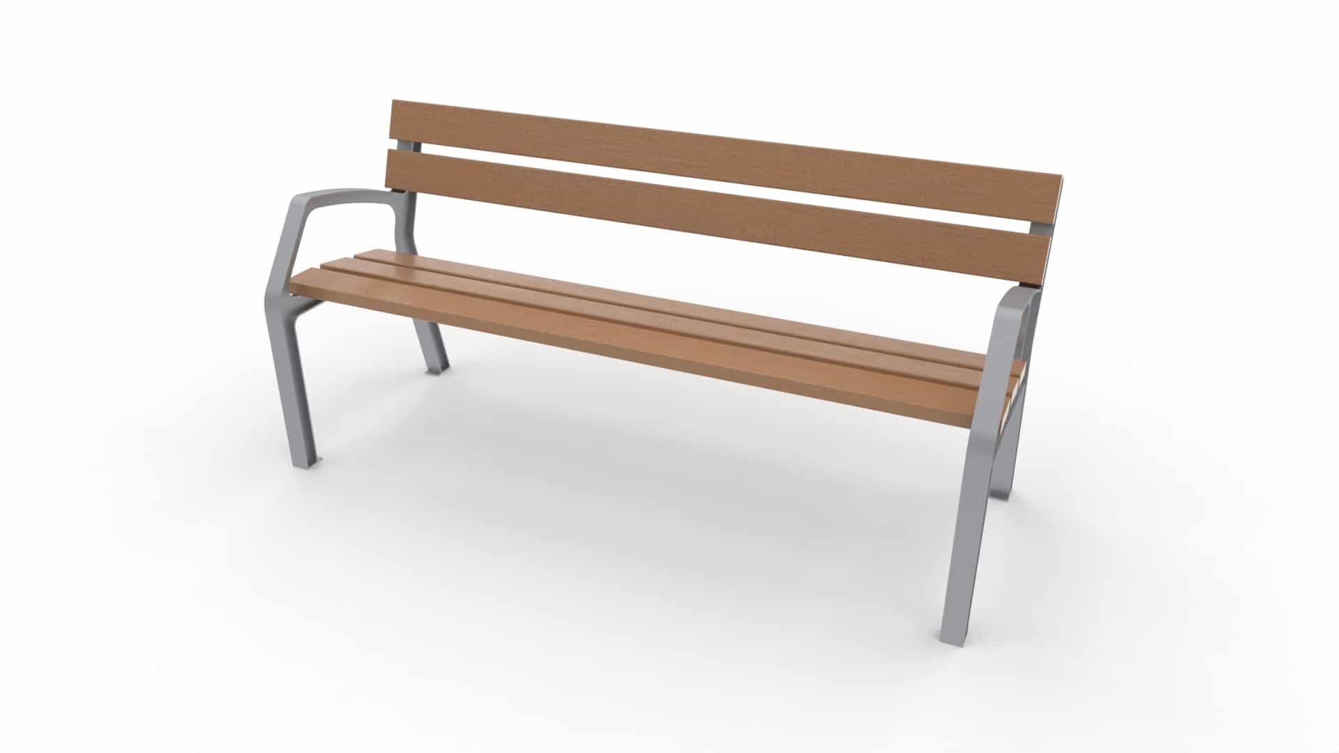 Banco urbano de diseño contemporáneo, ideal para plazas, parques y espacios públicos. El modelo ECR20 incorpora cinco listones de madera técnica, resistentes al sol, la humedad y el desgaste, montados sobre una estructura de aluminio con terminación en pintura electrostática libre de plomo y protección UV, que garantiza durabilidad y una apariencia elegante. Este banco combina estética, ergonomía y sustentabilidad, ofreciendo confort al usuario y bajo mantenimiento. Su diseño eco-friendly lo convierte en una opción moderna y responsable para proyectos de mobiliario urbano de alta calidad.