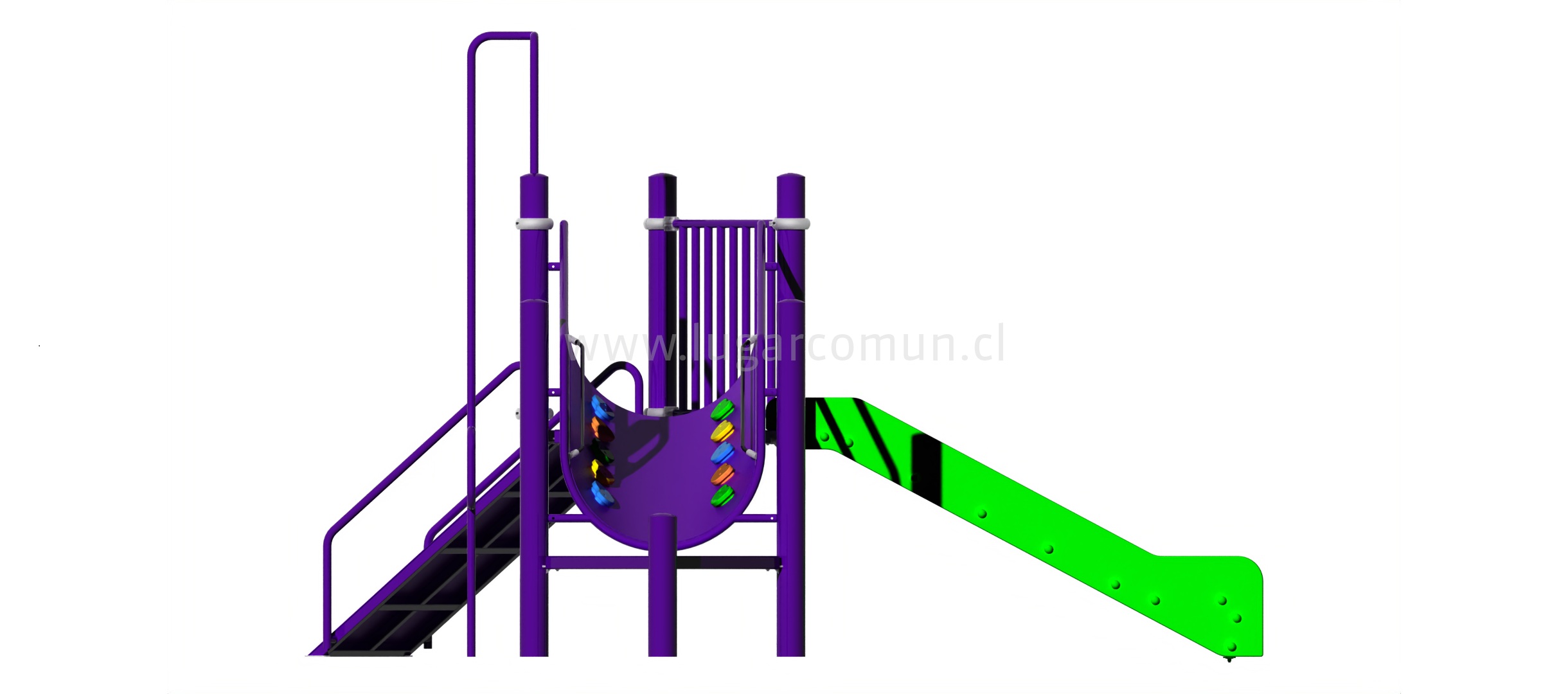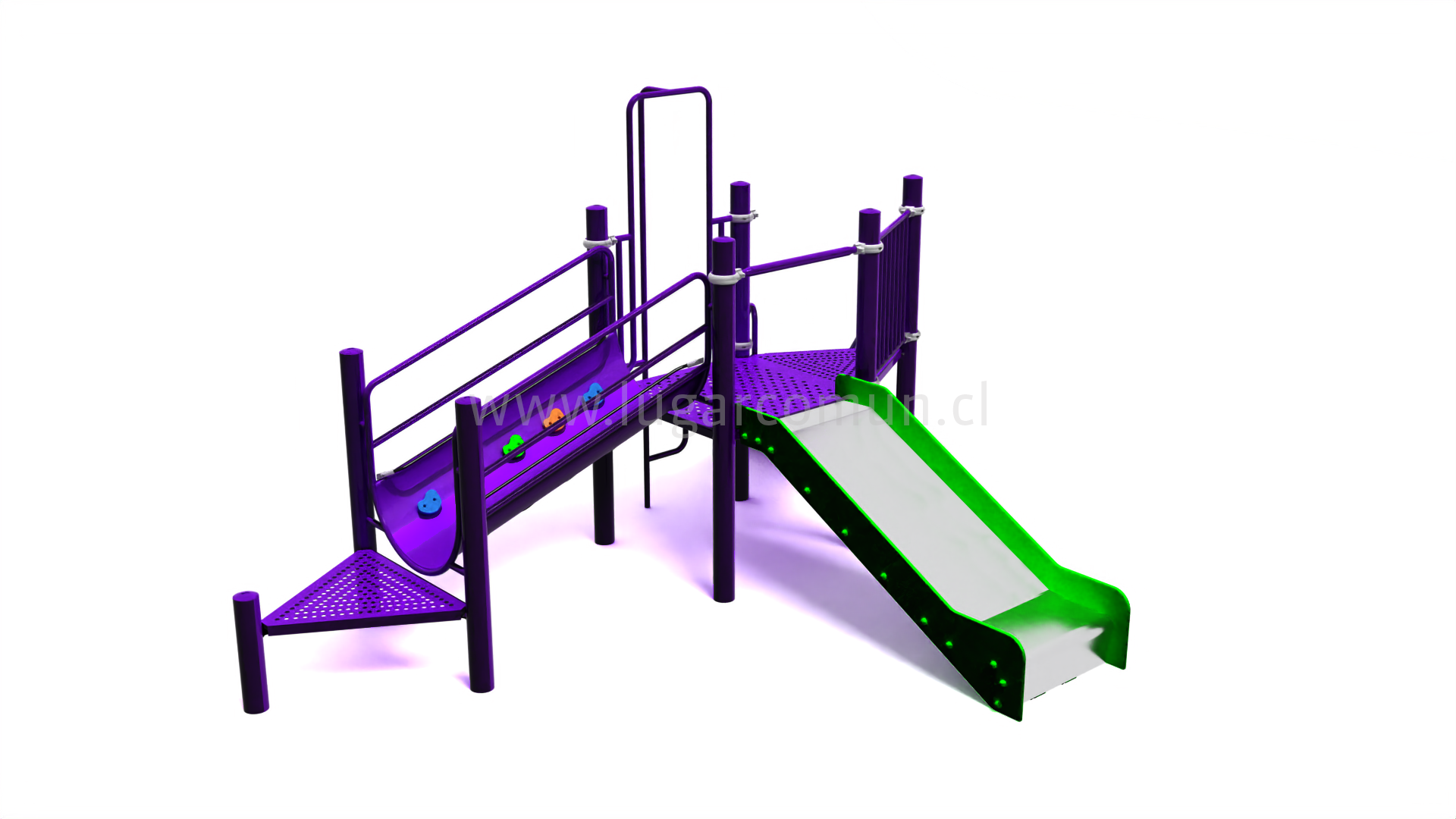 El Juego Modular 101 es una solución diseñada para fomentar la inclusión, la diversión y el desarrollo de habilidades físicas y sociales en los niños. Su diseño modular promueve la interacción y el desafío en un entorno seguro y accesible, convirtiéndolo en una opción ideal para plazas públicas, parques y áreas recreativas.êPensado especialmente para la inclusión, este juego cuenta con una rampa de arrastre y una plataforma de transferencia que facilitan el acceso a niños con movilidad reducida. Además, incluye un tobogán ancho fabricado en acero inoxidable y paneles de HDPE de 19 mm de espesor, un material 100% macizo, resistente al astillamiento, con protección UV y propiedades ignífugas. Estas características garantizan durabilidad y seguridad, ofreciendo una experiencia de juego confiable y duradera.êê